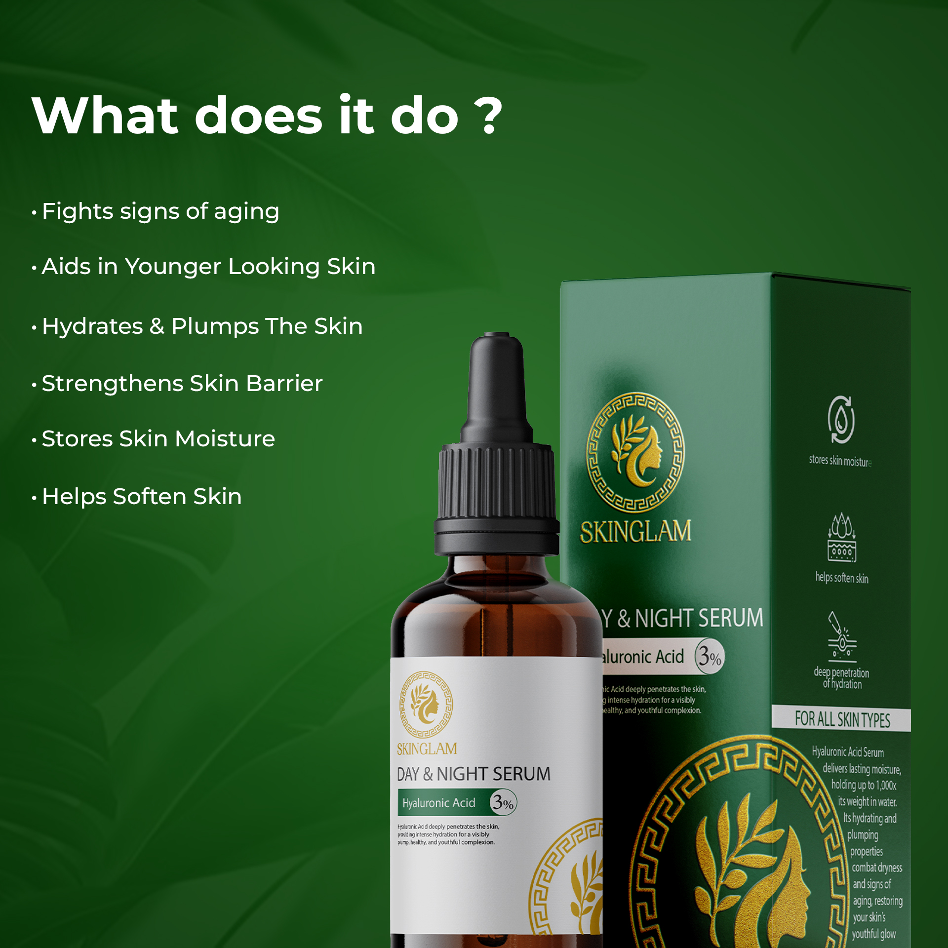 SkinGlam’s Day & Night Serum with 3% Hyaluronic Acid hydrates, plumps, and rejuvenates skin, providing deep moisture and a youthful glow, day and night.